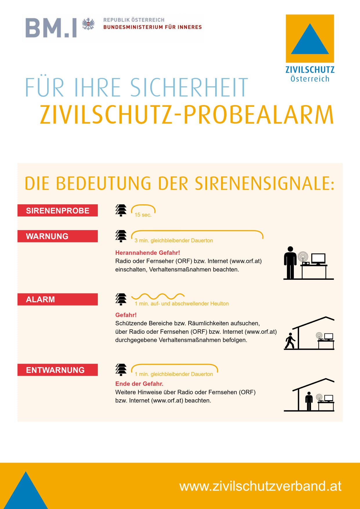 Am Probealarmtag werden in ganz Österreich zwischen 12:00 und 12:45 Uhr nach dem Signal „Sirenenprobe“ die drei Zivilschutzsignale „Warnung“, „Alarm“ und „Entwarnung“ ausgesendet. Der Probealarm dient einerseits der technischen Überprüfung des Warn- und Alarmsystems, andererseits soll er die Bevölkerung mit den Sirenensignalen und ihrer Bedeutung vertraut machen.